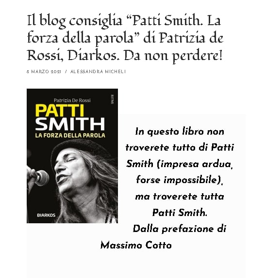 Il blog Les Fleurs Du Mal consiglia “Patti Smith. La forza della parola” di Patrizia de Rossi, Diarkos. Da non perdere!