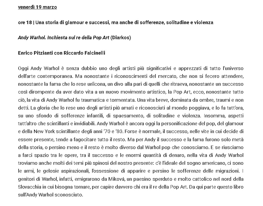 Andy Warhol. Inchiesta sul re della Pop Art. Enrico Pitzianti in diretta per il Circolo dei Lettori di Torino