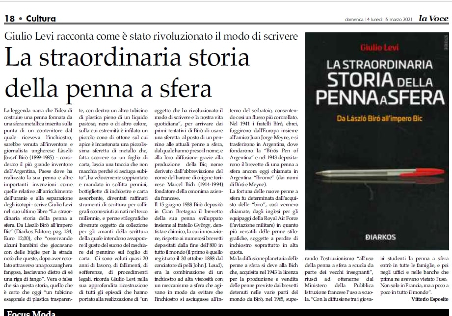 Giulio Levi racconta come è stato rivoluzionato il modo di scrivere La straordinaria storia della penna a sfera su La Voce quotidiano del 14/03/2021