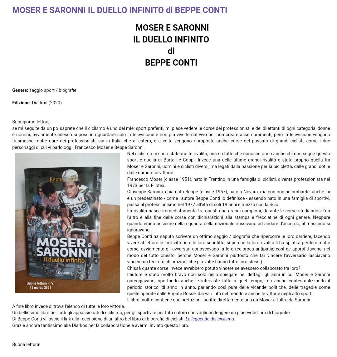 Recensione: MOSER E SARONNI IL DUELLO INFINITO di BEPPE CONTI sul blog Una buona lettura