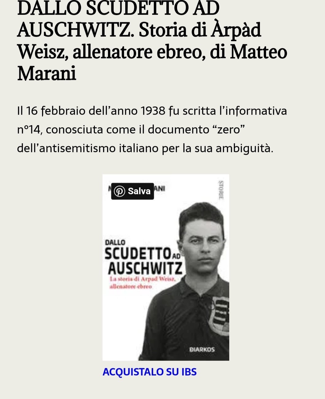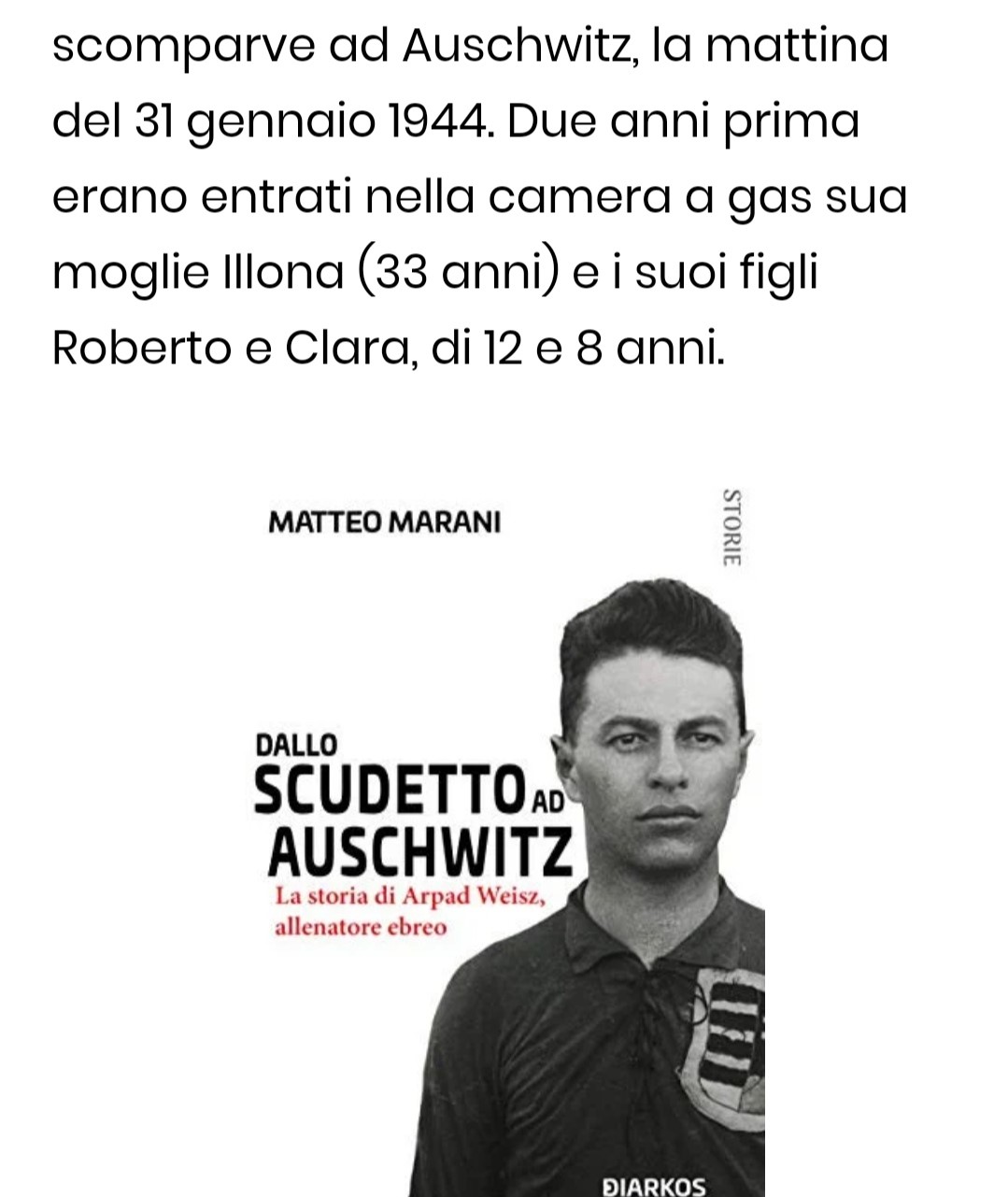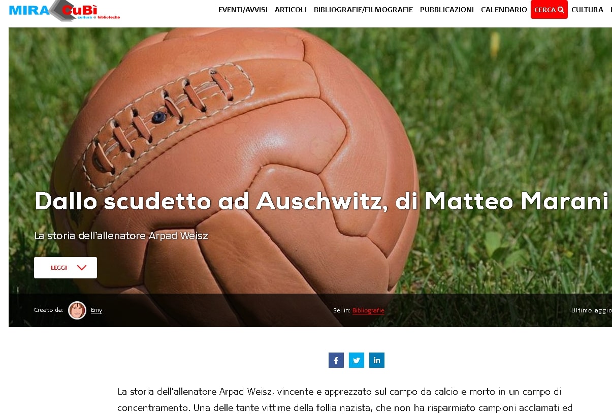DALLO SCUDETTO A AUSCHWITZ. Storia di Àrpàd Weisz, allenatore ebreo Matteo Marani su "Un libro tira l'altro ovvero il passaparola dei libri"