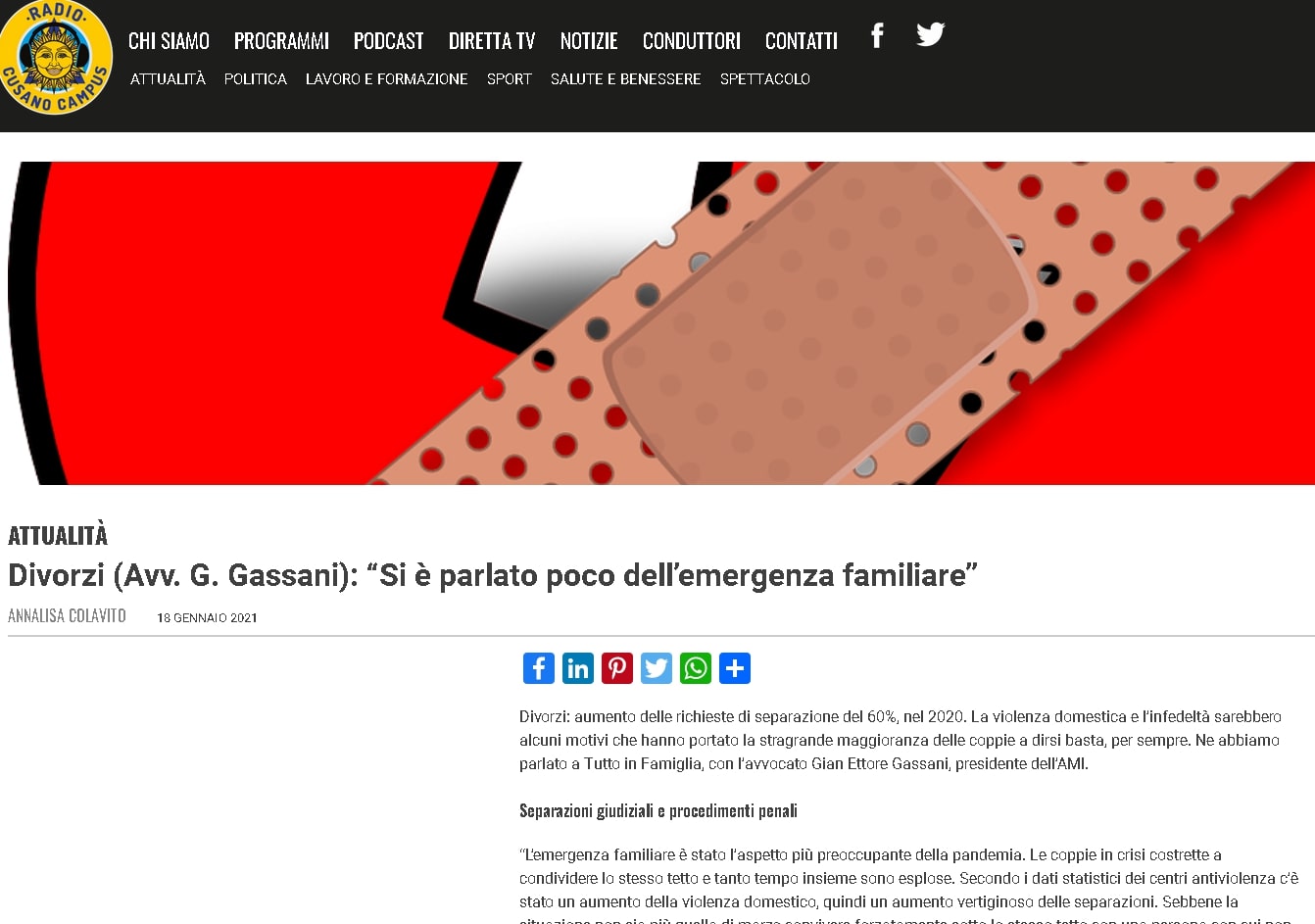 Divorzi (Avv. G. Gassani): “Si è parlato poco dell’emergenza familiare”. L'autore de "La guerra dei Rossi" intervistato per Radio Cusano Campus