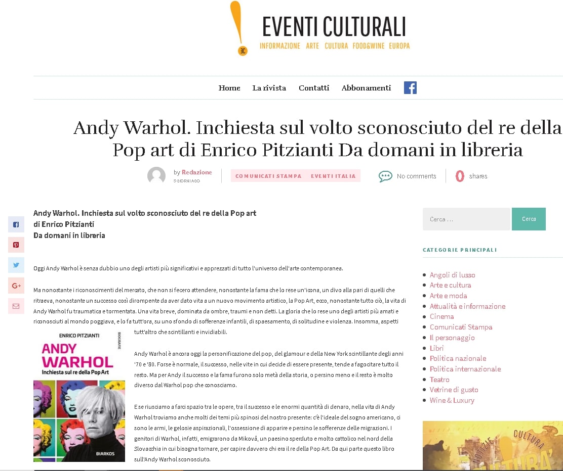 Andy Warhol. Inchiesta sul volto sconosciuto del re della Pop art di Enrico Pitzianti Da domani in libreria su Eventi Culturali Magazine