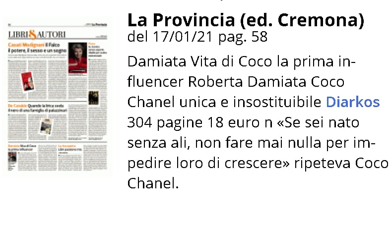 "Coco Chanel" di Roberta Damiata su La Provincia (ed. Cremona) del 17/01/21 pag. 58