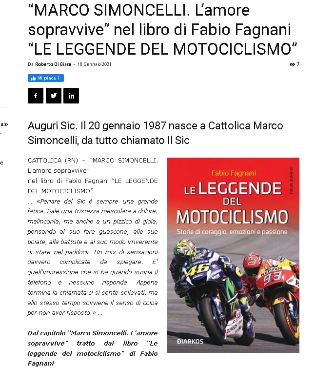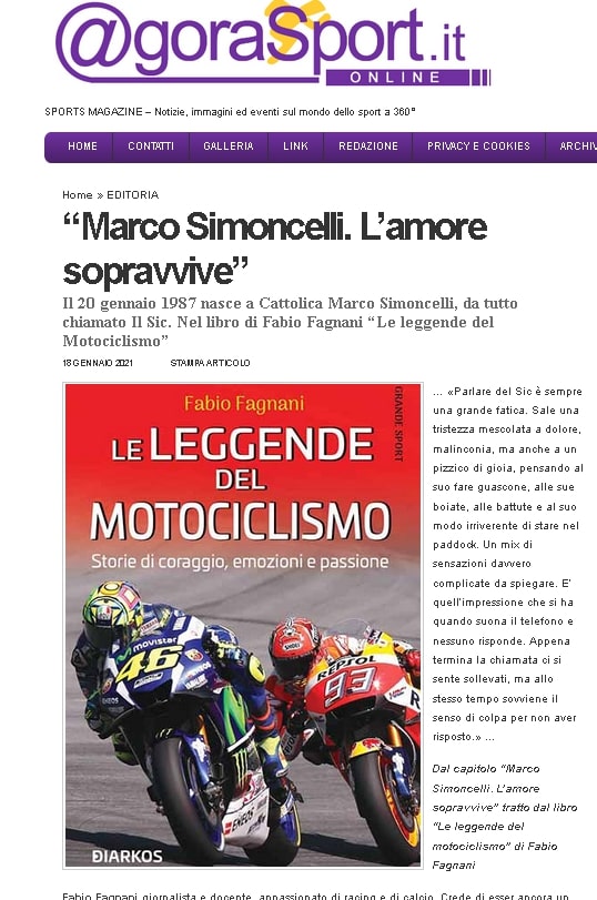 “Marco Simoncelli. L’amore sopravvive”. Le leggende del motociclismo di Fabio Fagnani su Agora sport Online