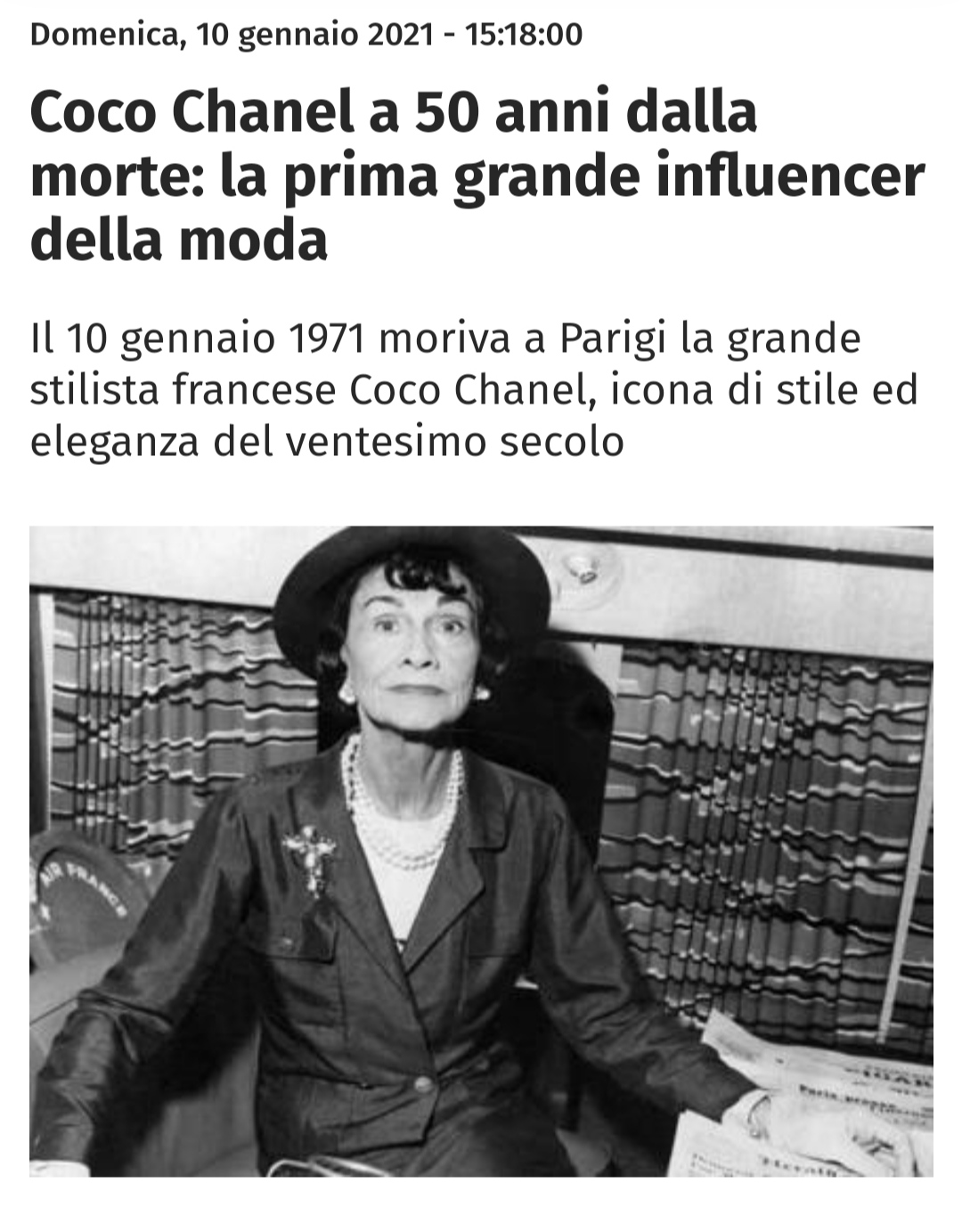 "Coco Chanel. Unica e insostituibile" su La Nuova Sardegna del 11/01/21 pag. 21 in occasione del 50esimo anniversario dalla morte