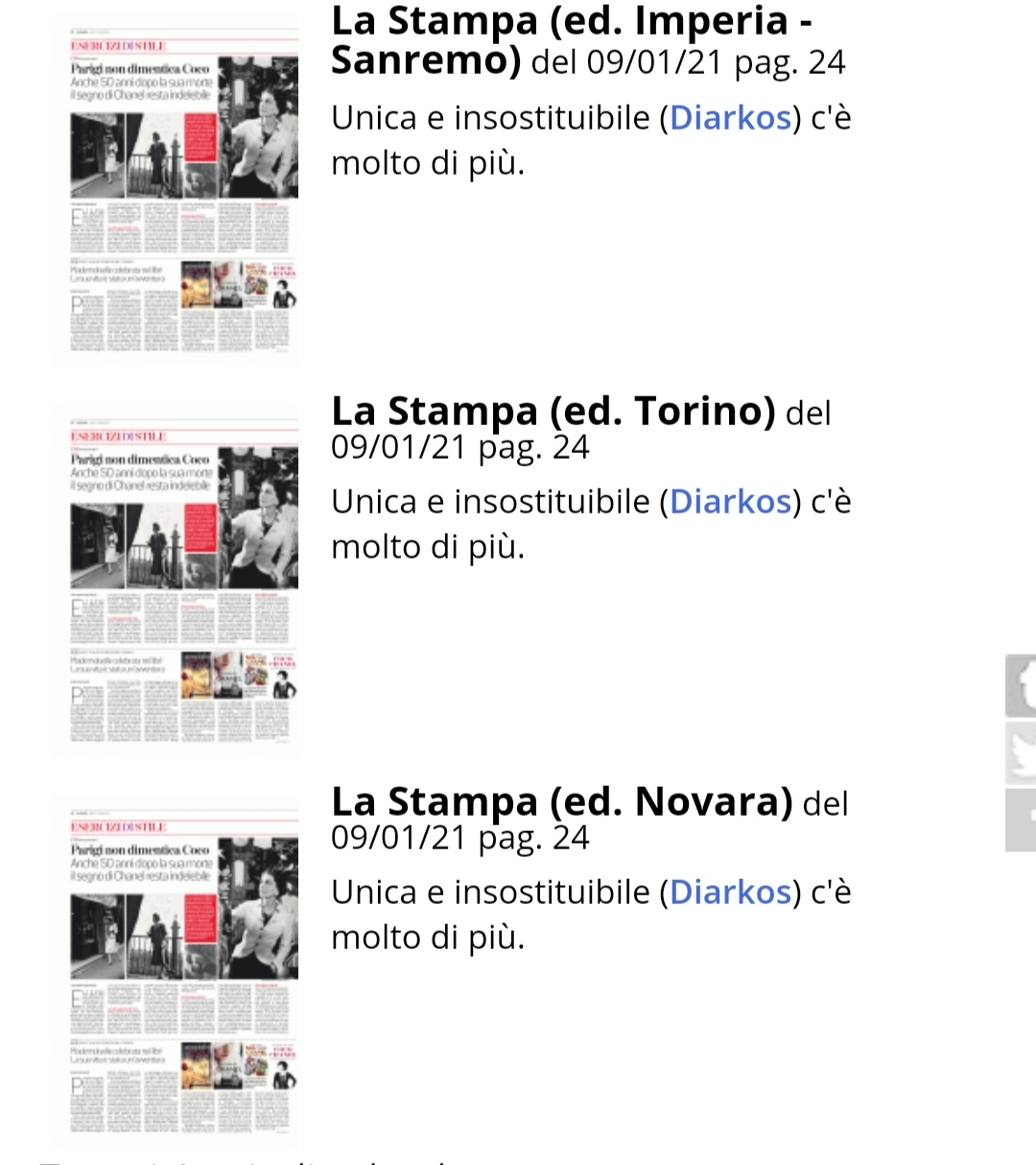 Coco Chanel. Unica e insostituibile di Roberta Damiata su La stampa a pag. 24 ed. Imperia- Sanremo, Torino, Novara