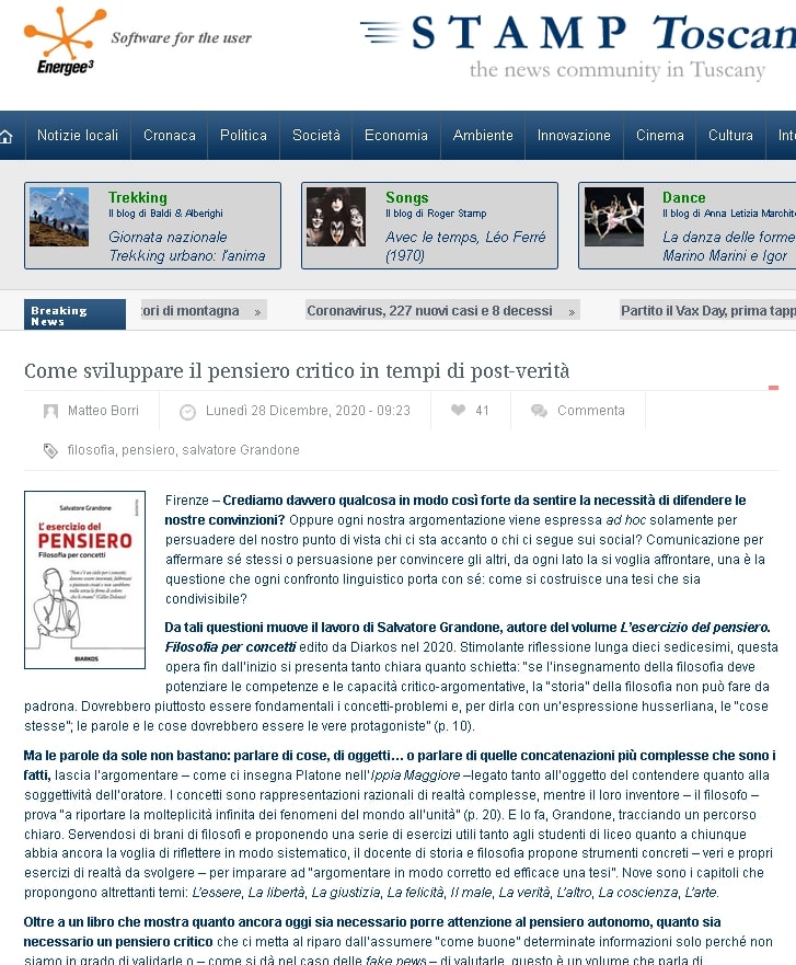 Come sviluppare il pensiero critico in tempi di post-verità. L'esercizio del pensiero di Salvatore Grandone su Stamp Toscana