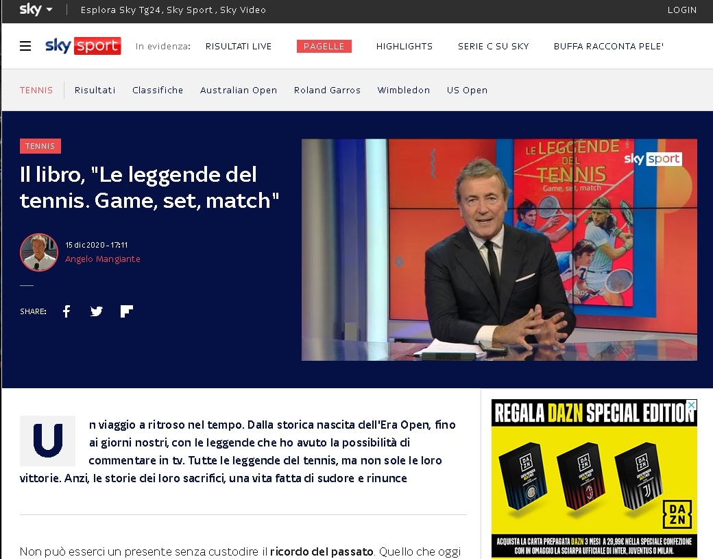 Angelo Mangiante presenta "LE LEGGENDE DEL TENNIS" a Sky Sport - Puntata del 15/12/2020 ore 16,30