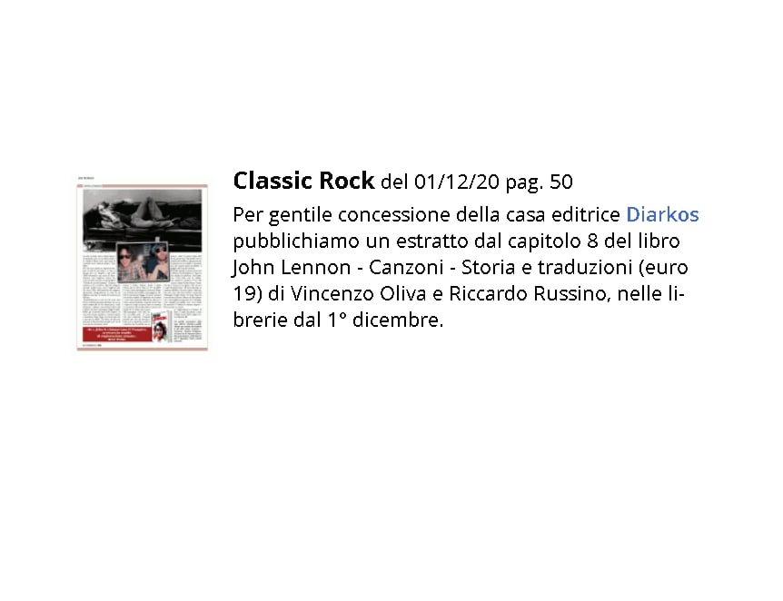 John Lennon. Canzoni, storia e traduzione di Vincenzo Oliva e Riccardo Russino su Classic Rock del 01/12/20 pag. 50