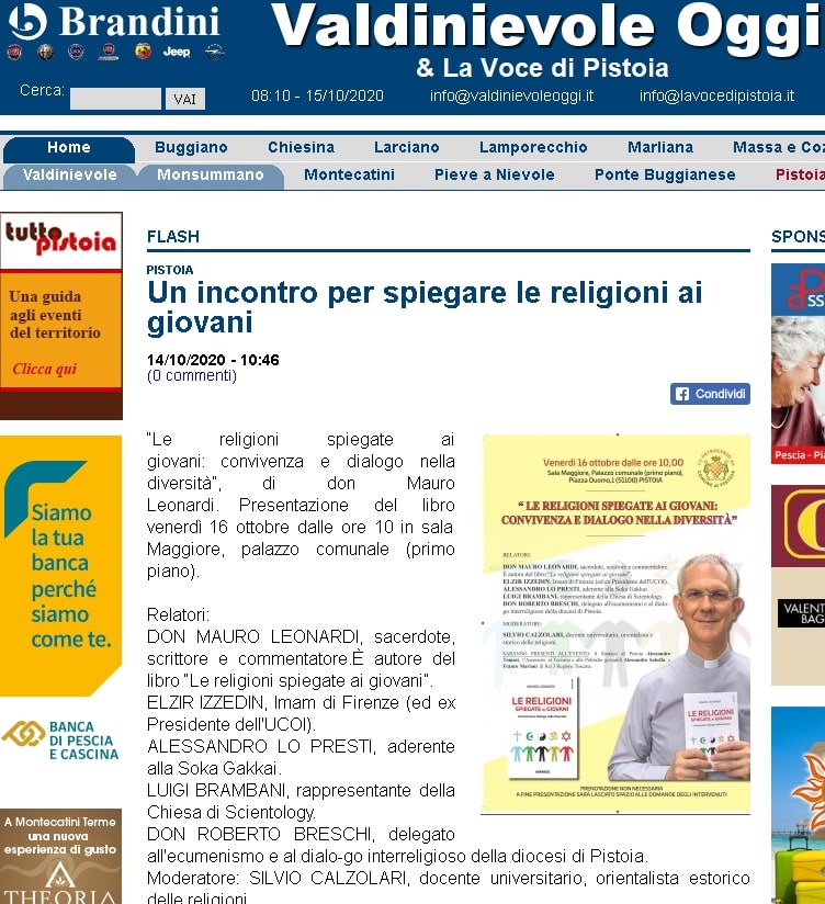 Presentazione del libro "Le religioni spiegate ai giovani" di Don Mauro Leonardi a Pistoia su Il Tirreno (ed. Prato-Pistoia-Montecatini) del 16/10/20 pag. 33