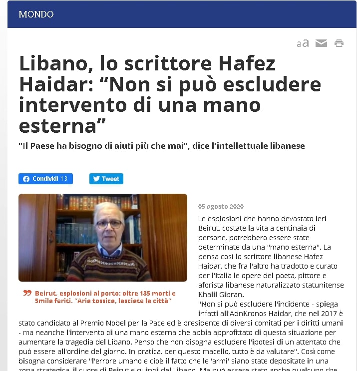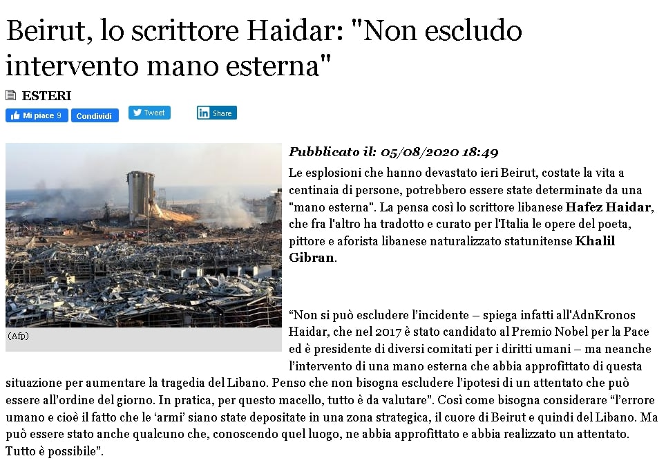 Beirut, lo scrittore Haidar: "Non escludo intervento mano esterna" su AdnKronos