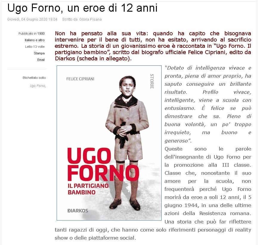 Alla vigilia dell' anniversario della morte di Ughetto, vittima della Resistenza che morì a soli dodici anni "Ugo Forno. Il partigiano bambino" di Felice Cipriani su tuttostoria.net