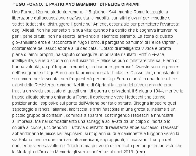 Nell'anniversario della morte di Ugo Forno, vittima della Resistenza romana. "Ugo Forno. Il partigiano bambino" di Felice Cipriani su Unoetre.it