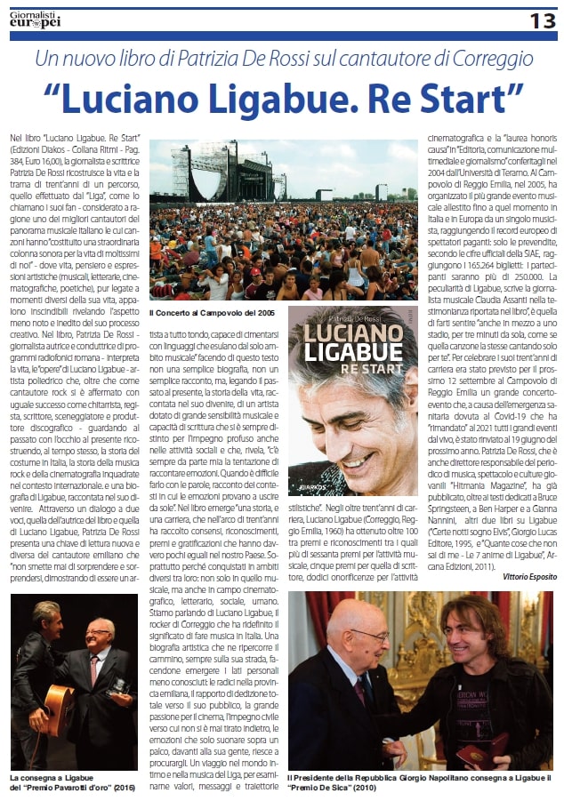 Luciano Ligabue. Restart di Patrizia De Rossi su "Giornalisti Europei" di lunedì 8 giugno 2020 a pag. 13