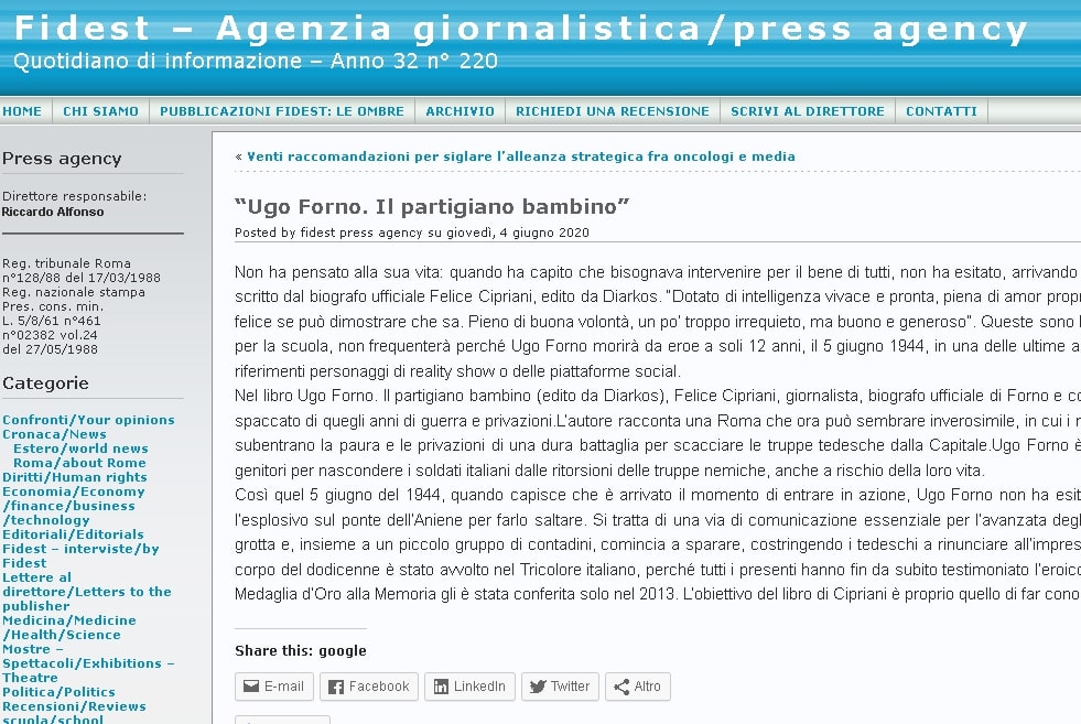 Ugo Forno. Il partigiano bambino di Felice Cipriani su Fidest- Agenzia giornalistica