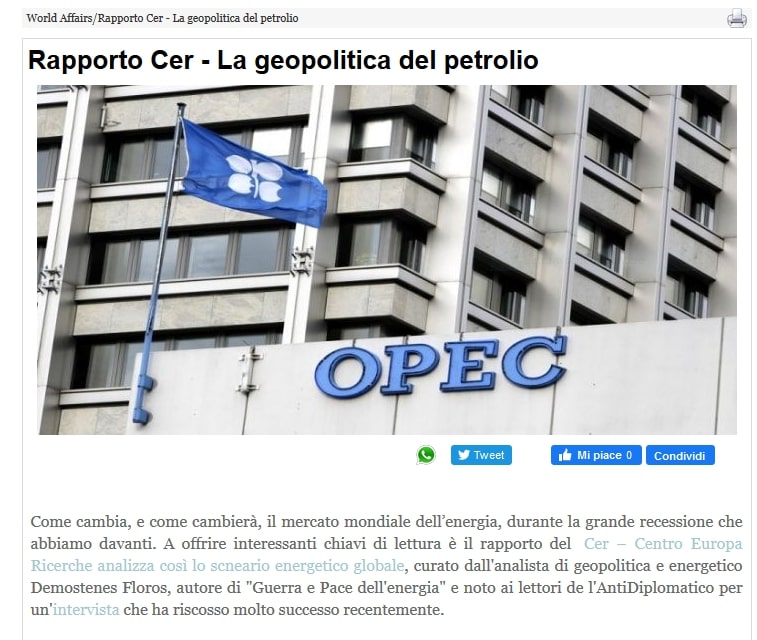 Rapporto Cer - La geopolitica del petrolio - Guerra e pace dell'energia di Demostenes Floros su L'Antidiplomatico