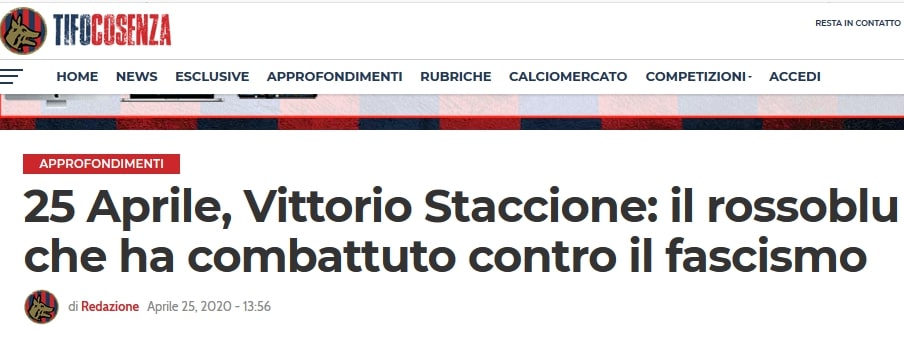 25 Aprile, Vittorio Staccione: il rossoblu che ha combattuto contro il fascismo, "Il mediano di Mauthausen" di Francesco Veltri su TifoCosenza