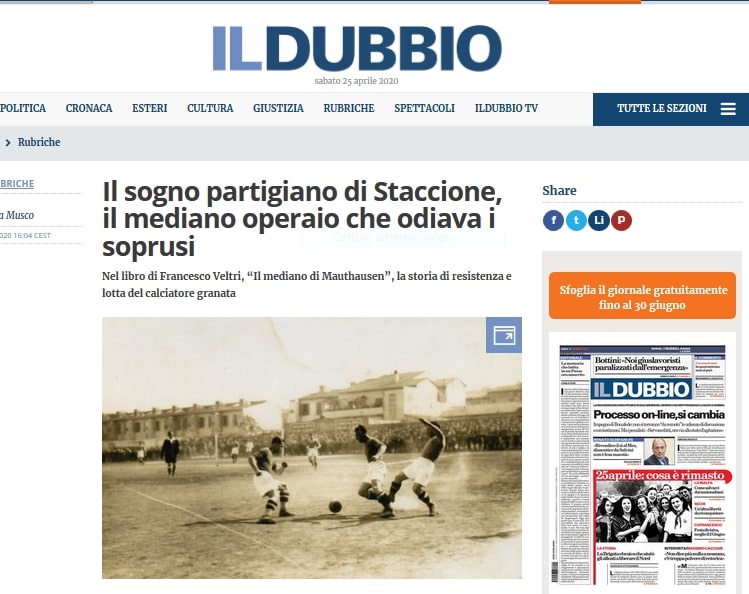 Il mediano di Mauthausen di Francesco Veltri su La Voce del 24 aprile 2020 a pag. 9