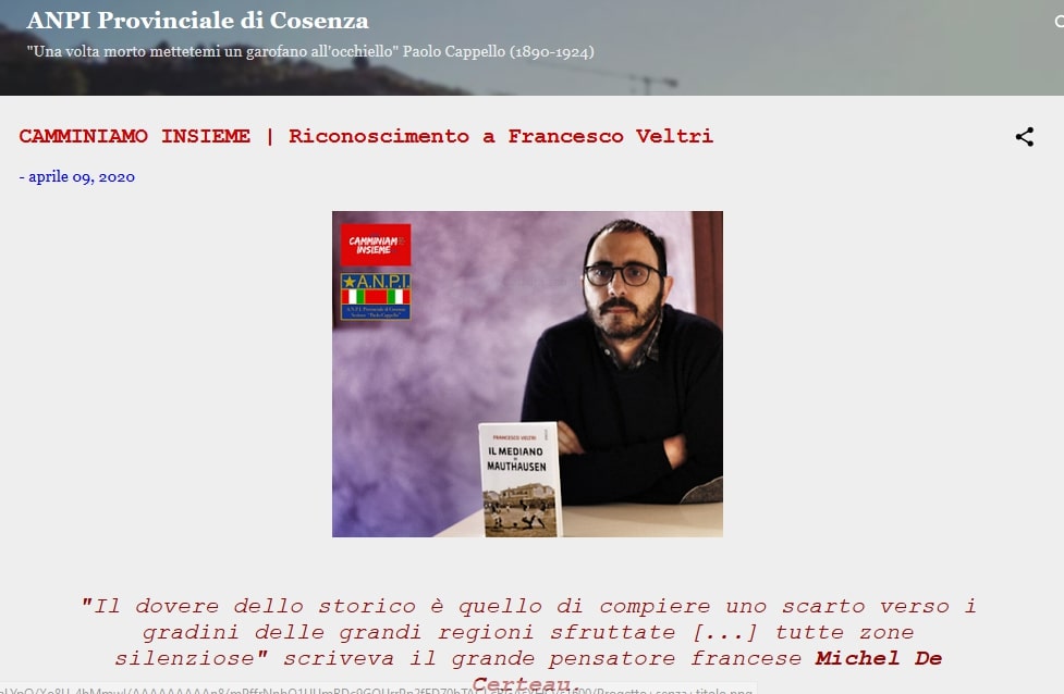 Riconoscimento a Francesco Veltri autore de "Il mediano di Mauthausen" da ANPI Cosenza