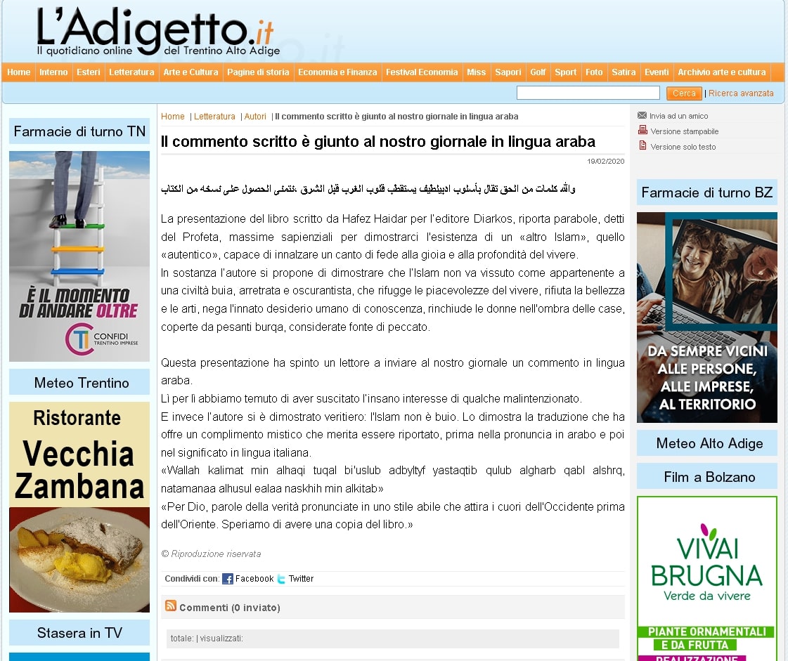 Un bellissimo commento in lingua araba apparso su L'Adigetto.it in merito al libro di Hafez Haidar "Maometto e i fiori del Corano"