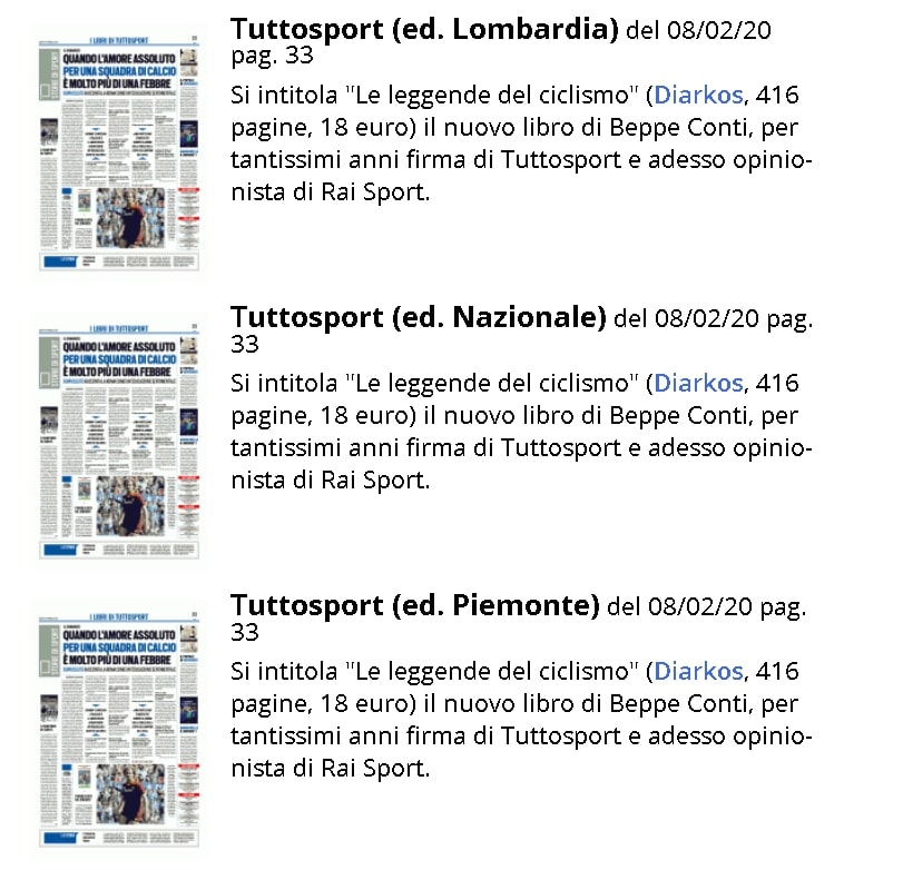 LE LEGGENDE DEL CICLISMO di Beppe Conti su Tuttosport (ed. Nazionale) del 08/02/20 pag. 33