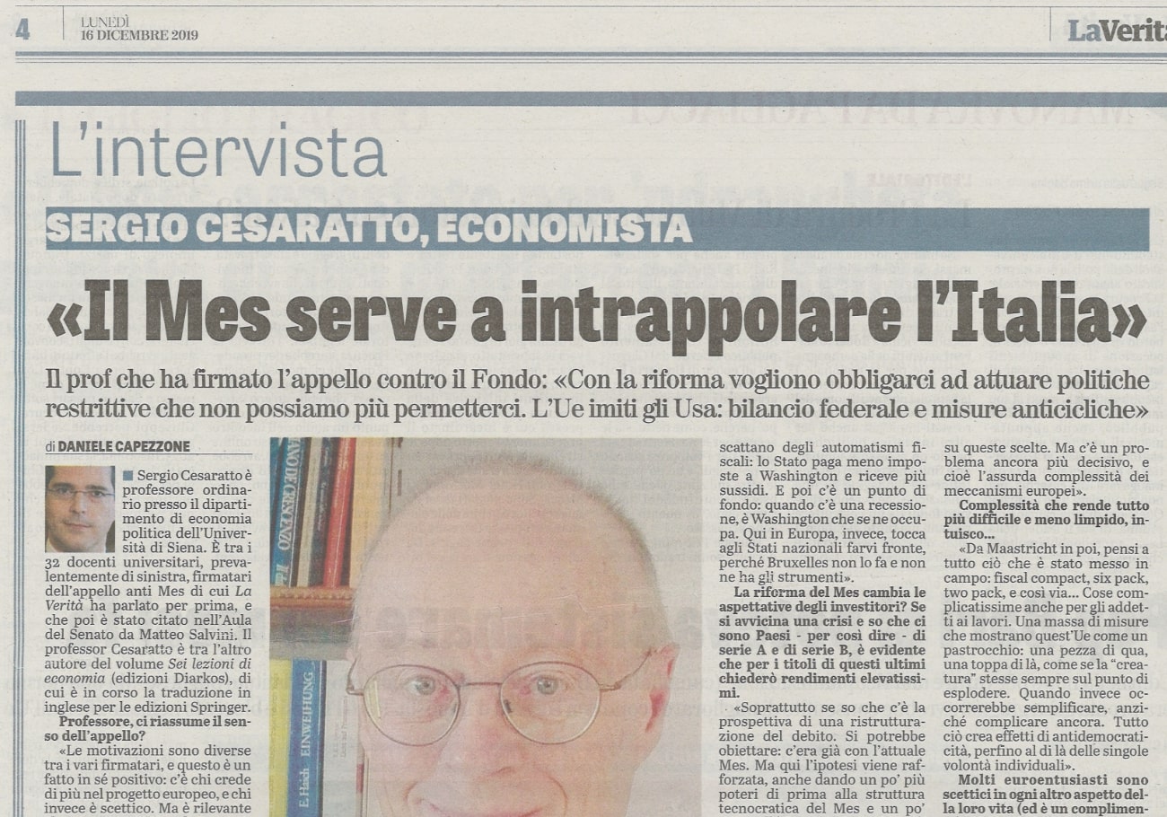 <> Intervista a Sergio Cesaratto autore di "Sei lezioni di economia" su La Verità