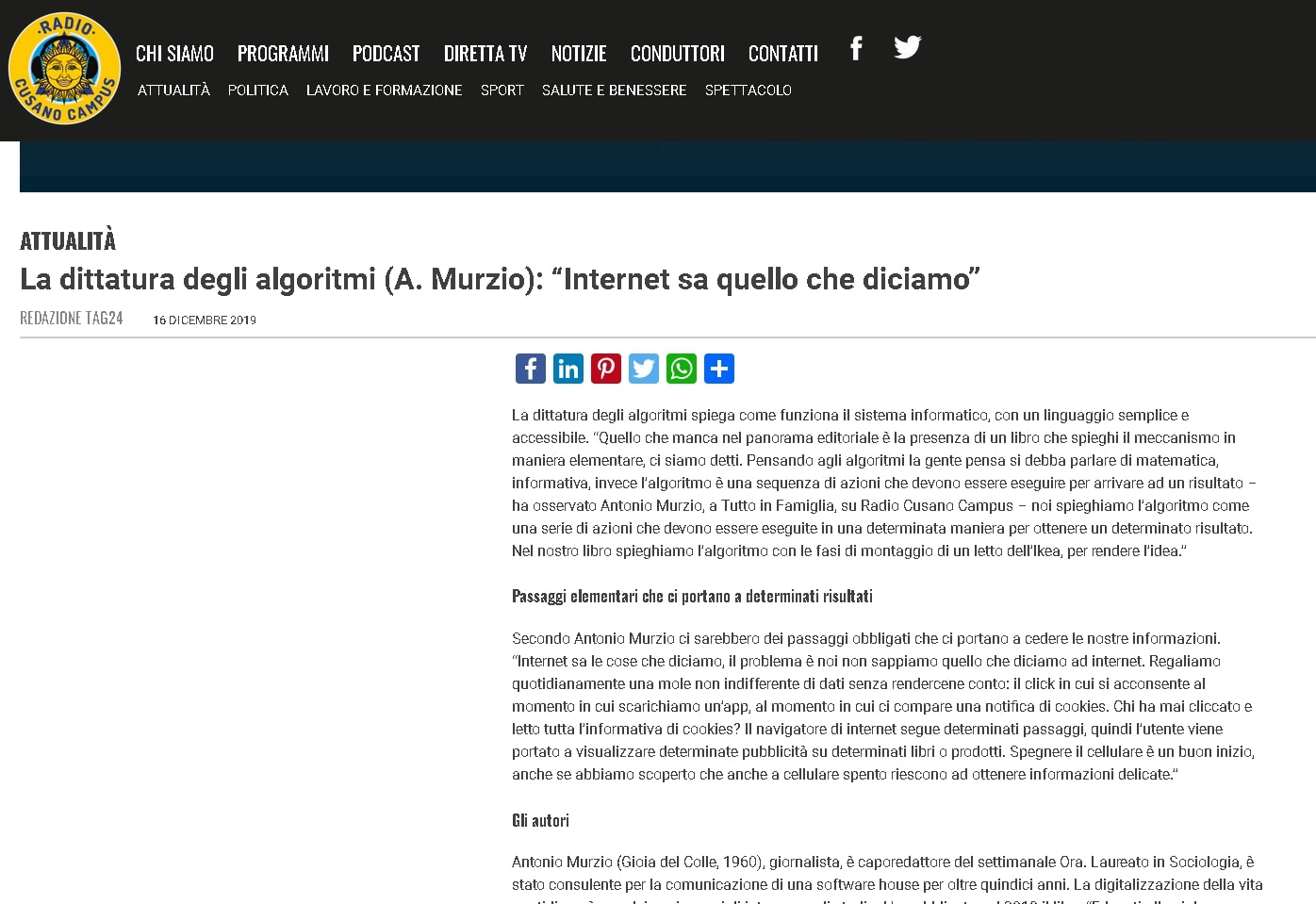 La dittatura degli algoritmi (A. Murzio): “Internet sa quello che diciamo”. Intervista Radio Cusano Campus