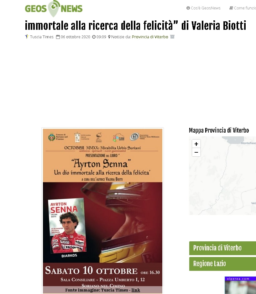 A Soriano nel Cimino la presentazione del libro “Ayrton Senna. un dio immortale alla ricerca della felicità” di Valeria Biotti su Geosnews