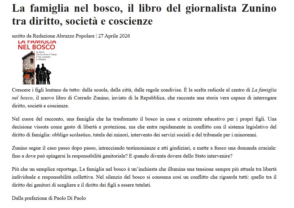 La famiglia nel bosco, il libro del giornalista Zunino tra diritto, società e coscienze - Abruzzo popolare