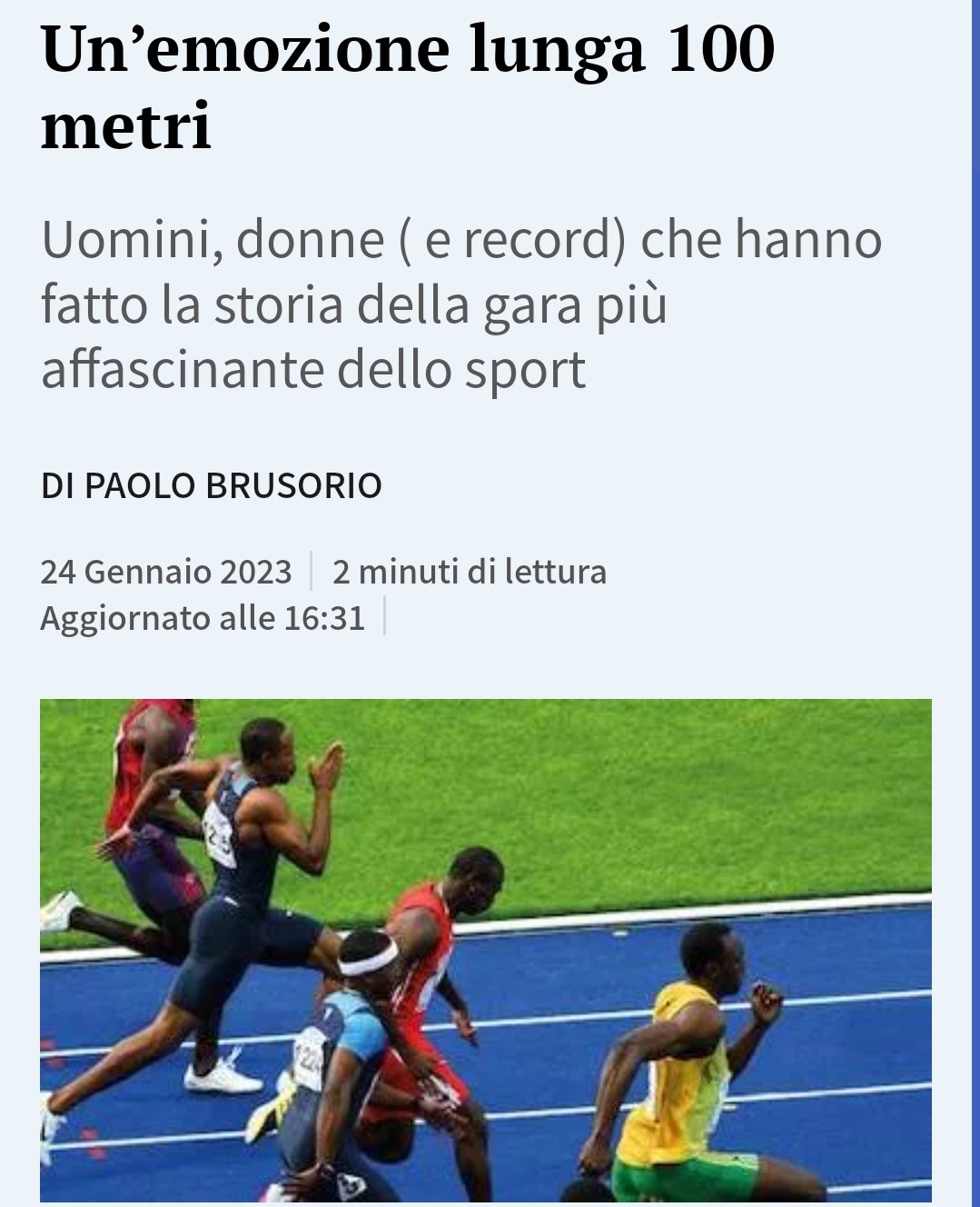 Il primo re di Olimpia è l’americano Thomas Burke: è il 1896 e l’americano ruba la scena e il racconto iniziale di Colombo-Monti. Vince il primo oro nella storia dei Giochi e mette un piede nella storia, ed è un’impronta pesante tanto da non esserne ancora uscito: ad Atene centra la vittoria nei 400 metri, unico ad avercela fatta. Da Burke in poi, il libro è una volata mozzafiato. La prima volta delle donne arriva nel 1928, Giochi di Amsterdam. Le finaliste sono solo 4, le altre due fuori gara per falsa partenza. L’oro è dell’americana Robinson, portata in pista da un insegnante di scienze che l’aveva vista correre per non perdere l’autobus. Ecco, Burke e Robinson sono la preistoria dei 100, ma anche le colonne portanti del più grande spettacolo dopo il big bang. O, anche solo dopo il bang. Ci sono Owens e Carl Lewis, la grande truffa di Ben Johnson e la Grande Bellezza di Usain Bolt, l’uomo che ha spostato i confini dello sprint in un territorio che nessuno ha più calpestato. Bolt a Pechino nel 2008 e poi a Berlino nel 2009 dove ha fissato quel 9”58 che è il record del mondo attuale e anche il limite degli umani.