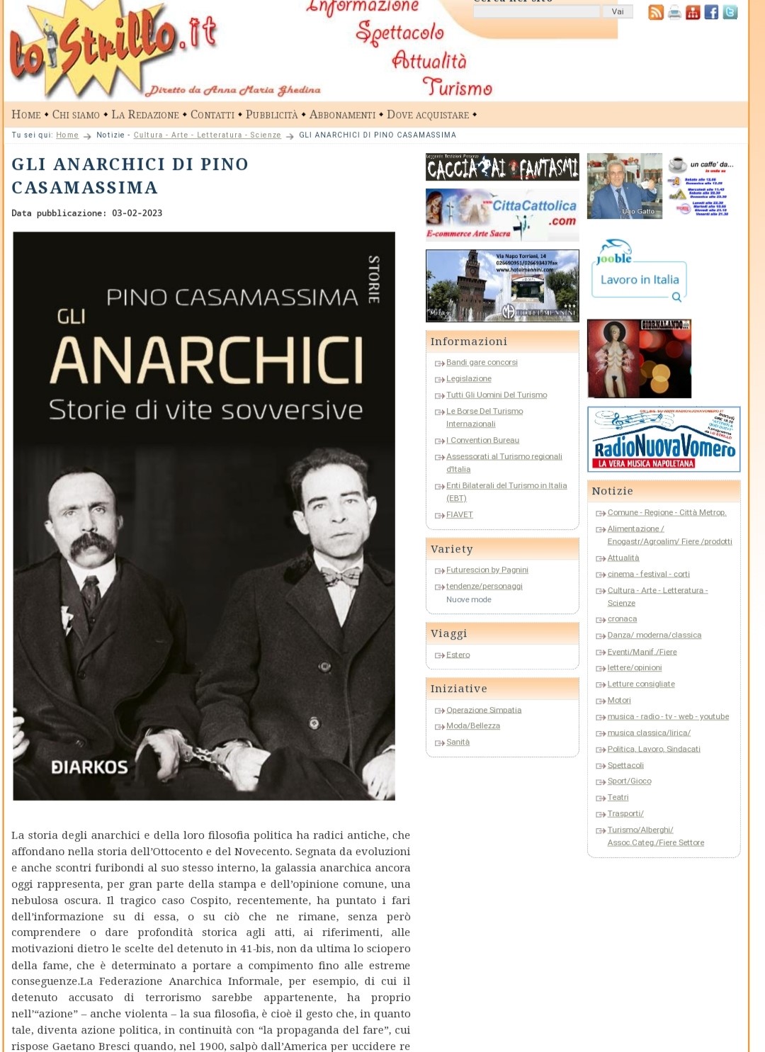In questi giorni, con la parola “Anarchia” al primo posto fra le ricerche di Google, mentre si leggono “castronerie” storiche che uniscono gli anarchici alla mafia e alle Brigate rosse, il libro edito da Diarkos di Pino Casamassima, Gli anarchici. Storie di vite sovversive (2022), di cui alleghiamo scheda, fa luce su questa tradizione sovversiva, in particolare italiana, e soprattutto sull’aspetto umano, antropologico e storico dei suoi protagonisti: da Felice Orsini, inventore di una bomba che porterà poi il suo nome e attentatore alla vita di Napoleone III, a Luigi Lucheni, che con una lima spezzò la vita della principessa Sissi; da Giovanni Passannante e Pietro Acciarito, che provarono a uccidere il re d’Italia prima di Gaetano Bresci, agli innocenti Sacco e Vanzetti, giustiziati perché italiani e anarchici, sulla sedia elettrica, negli Stati Uniti degli anni Venti.