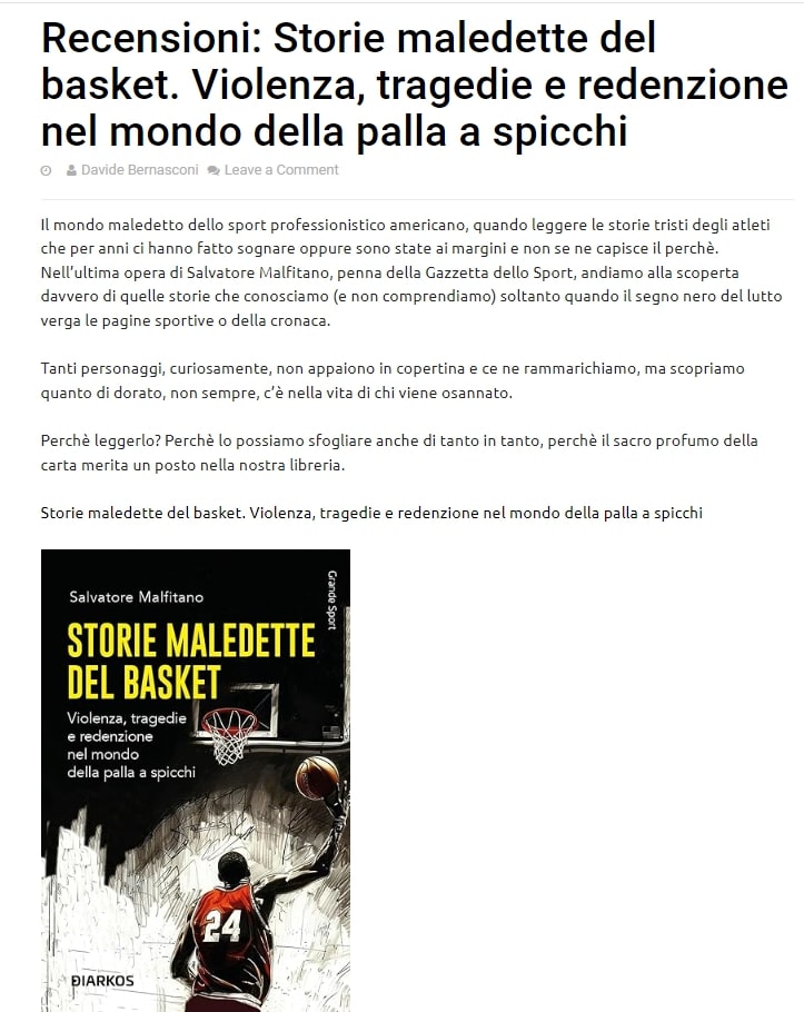 Il mondo maledetto dello sport professionistico americano, quando leggere le storie tristi degli atleti che per anni ci hanno fatto sognare oppure sono state ai margini e non se ne capisce il perchè. Nell’ultima opera di Salvatore Malfitano, penna della Gazzetta dello Sport, andiamo alla scoperta davvero di quelle storie che conosciamo (e non comprendiamo) soltanto quando il segno nero del lutto verga le pagine sportive o della cronaca.