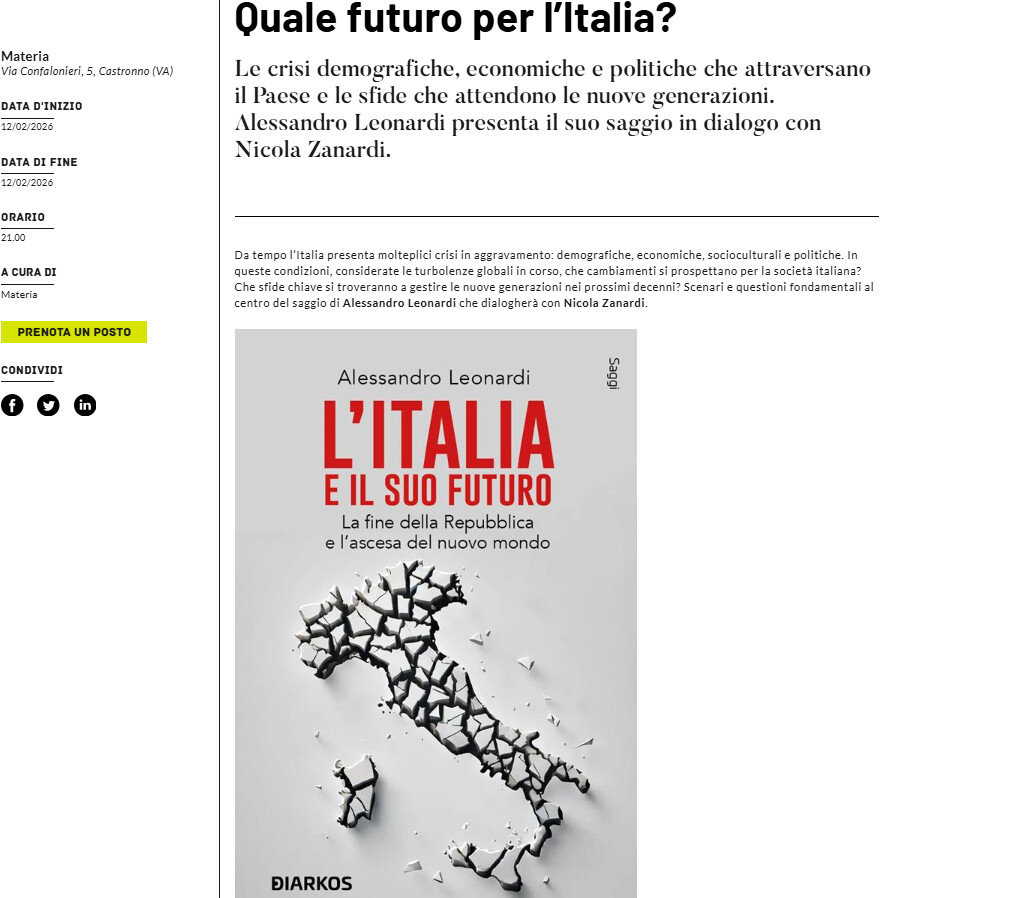 Da tempo l’Italia presenta molteplici crisi in aggravamento: demografiche, economiche, socioculturali e politiche. In queste condizioni, considerate le turbolenze globali in corso, che cambiamenti si prospettano per la società italiana? Che sfide chiave si troveranno a gestire le nuove generazioni nei prossimi decenni? Scenari e questioni fondamentali al centro del saggio di Alessandro Leonardi che dialogherà con Nicola Zanardi.