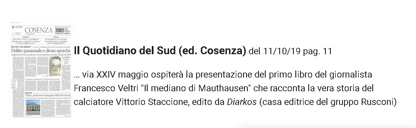 Il Mediano di Mauthausen di Francesco Veltri su Il Quotidiano del Sud (ed. Cosenza) del 11/10/19 pag. 11