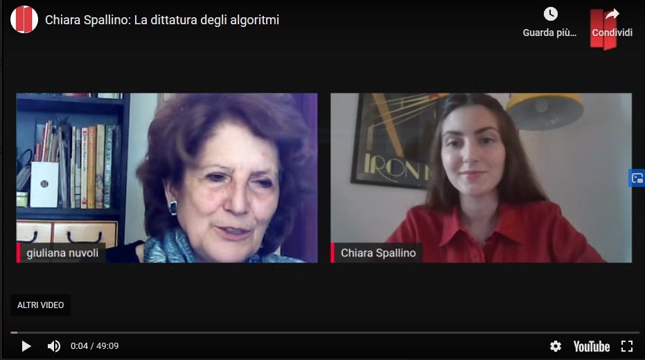 Chiara Elisa Spallino autrice insieme ad Antonio Murzio del libro " La dittatura degli algoritmi" è stata oggi in diretta streaming sul sito di Casa della Cultura di Milano. L'autrice ha parlato del suo libro nell'ambito del ciclo di incontri "Vitalità della scrittura 2020 - I Padri e il Potere", a cura di Giuliana Nuvoli.