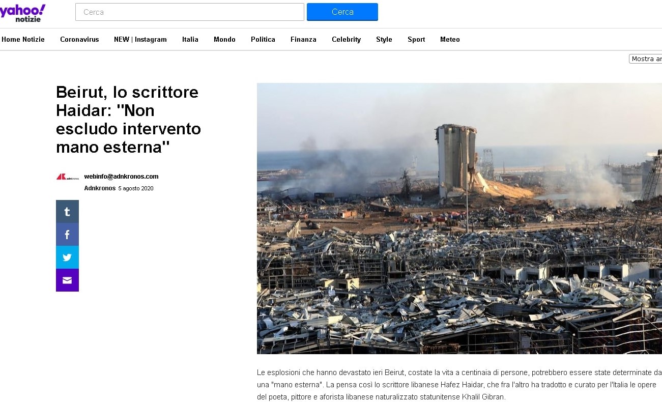 Le esplosioni che hanno devastato ieri Beirut, costate la vita a centinaia di persone, potrebbero essere state determinate da una "mano esterna". La pensa così lo scrittore libanese Hafez Haidar, che fra l'altro ha tradotto e curato per l'Italia le opere del poeta, pittore e aforista libanese naturalizzato statunitense Khalil Gibran.
